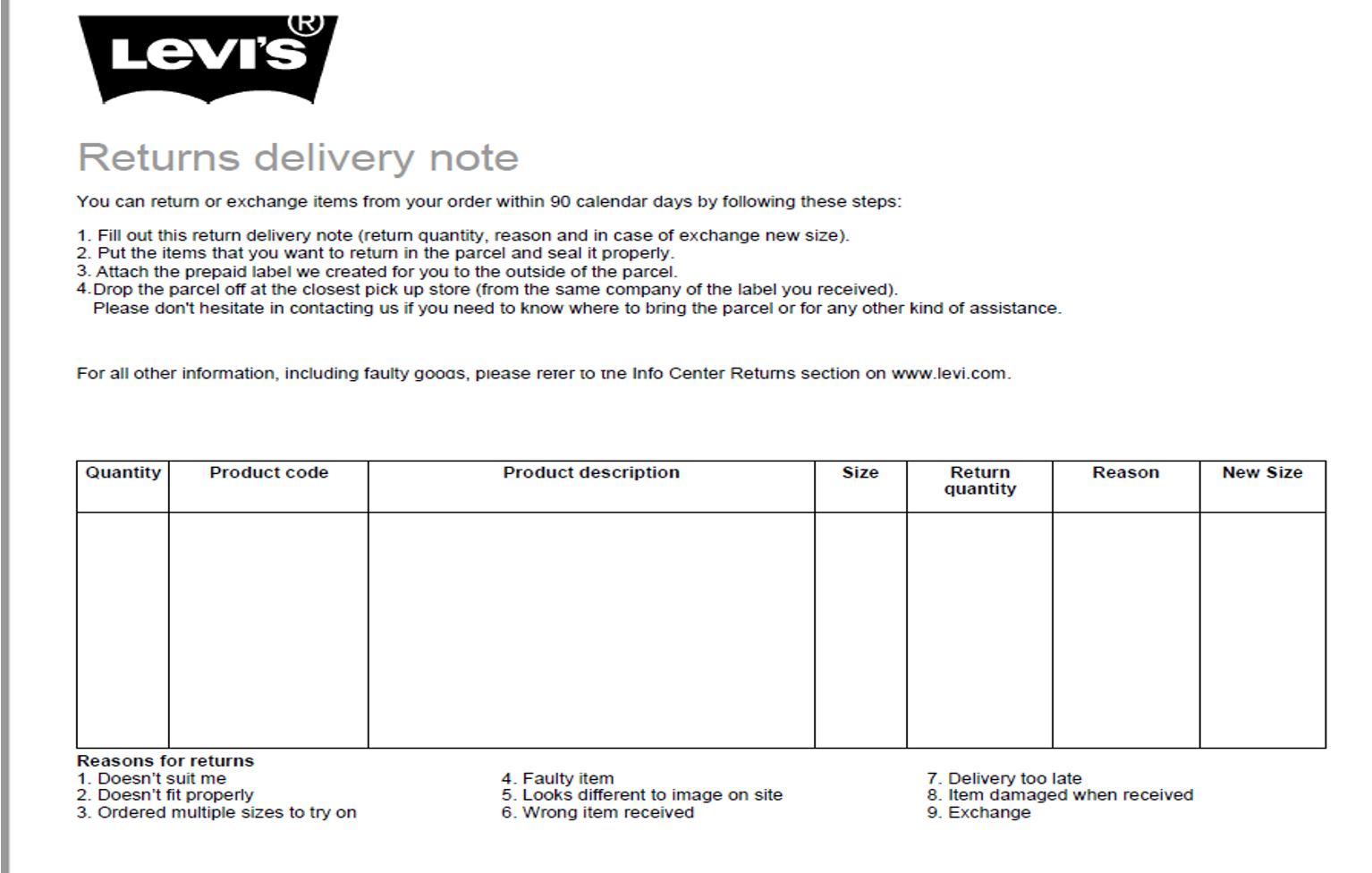 Mit jedem levi.com-Paket erhaltst du einen Retouren-Lieferschein. Du kannst den Retourenlieferschein nicht finden? Du kannst das Formular am Ende dieses Artikels herunterladen und ausdrucken.