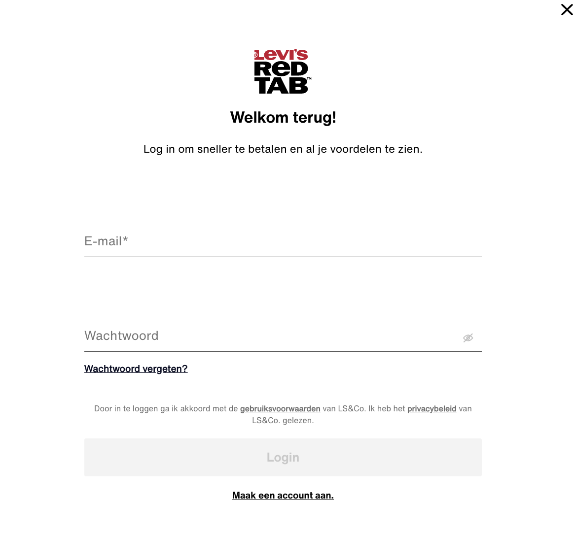 Je wachtwoord vergeten? Dat kan iedereen overkomen. Wij zijn er om je te helpen, zodat je kunt blijven winkelen bij Levi.com. Vul hier jouw e-mailadres in en selecteer ¨Wachtwoord vergeten¨.